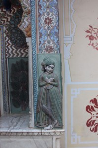 From the observatory, we walked over to the city palace. The palace includes museums containing artworks and weaponry, in addition to the royal residence. They have two large (900 gallon) silver vessels that were filled with water from the Ganges when the Maharaja visited England. Of course, they were filled high upstream where the water is pure as it melts from the Himilayan Mountains.
