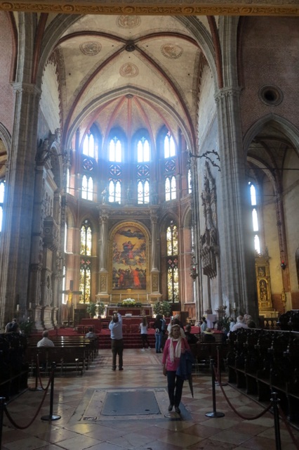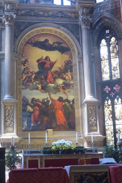 Next we zig-zagged our way over to the Basilica of Santa Maria Gloriosa dei Frari (St Mary’s of the Friars). The church is very large and contains many beautiful pieces of art. The main object that most people visit to see is “The Assumption”. It is huge and it is beautiful. Some say that it is one of the most beautiful paintings of all time. In addition, there were masterpieces by Bellini and Veneziani that were also beautiful. And overall, it is quite a bargain at 3 Euro.