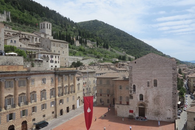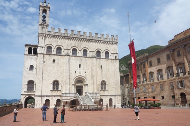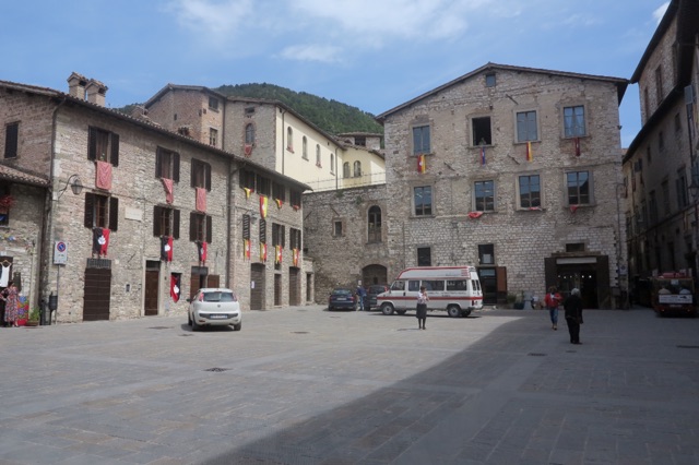 We made our way through the city gates and into the first of many squares we would see in Gubbio. The town is decorated with the flags of the four quarters as they just celebrated with a festival called the Ceri. More on that later.