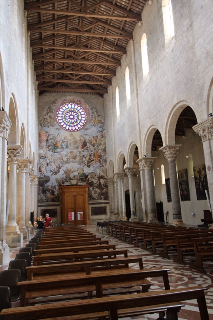 Back to the earlier time, we went into the Duomo and walked around. It is another church that is not overly ornate, just a simple house of prayer. The highlight that people talk about is the rear wall with it’s stained glass rose window and painting. Really beautiful colors! We lit candles in memory of our families and then headed back out into the piazza.