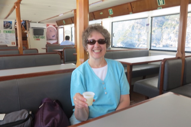 Very nice being next to the water, even if it is just waiting to go. The sea was rolling, not big waves, just swales. The boats were bobbing and the sun was shining. Boarding time came quickly. Easy enough getting the bags across the gang plank. We chose to sit inside. We’ll get lots of fresh air in Capri, no sense tempting Sue’s cold.