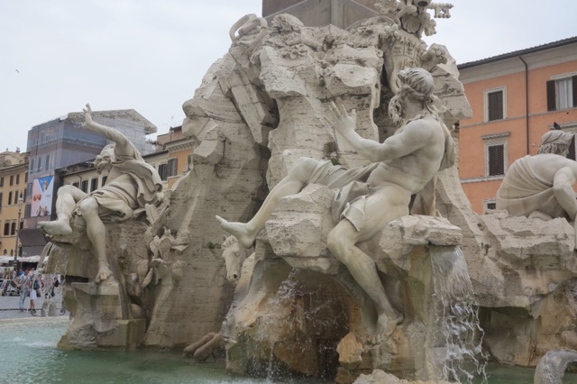 Piazza Navona has one of the famous Bernini sculptures as its centerpiece. The fountain is called “The Four Rivers” and represents the Ganges, the Nile, the Danube and the Rio de la Plata. There are two other sculpture fountains at either end of the Piazza.