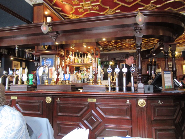 We walked through the town a bit and stopped at a pub for a bite to eat and a bit of refreshment. So our first pub meal was fish and chips with mushy peas. Mine washed down with a blonde ale and Sue’s with a large pinot grigio.