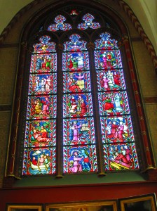 We had to make a stop back at the hotel to grab our sunglasses and to slather on some sunscreen before going for a walk. We walked along the canal and headed for the Church of Our Lady. It was built in the fifteenth century, took two centuries to complete and has a bell tower that is 122 meters tall. It has beautiful stained-glass windows and contains many artistic treasures highlighted by the only sculpture by Michaelangelo that left Italy during his lifetime. It is a statue carved in 1504 that is the Madonna and Child.