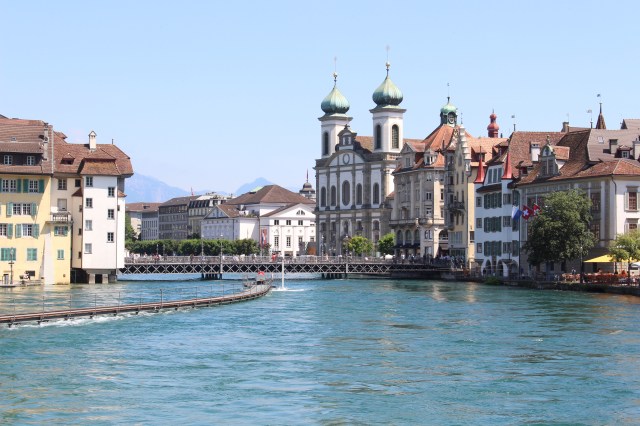 When we returned to Lucerne, we were still too early to check in, so we took a walk around the old town and the waterfront to see some of Lucerne’s treasured sites. We started at the Chapel Bridge. It’s a covered wooden bridge that spans the river. It was originally built in 1500 and has been rebuilt a couple of times due to damage and fire. It certainly seemed to be the center of everyone’s attention today.