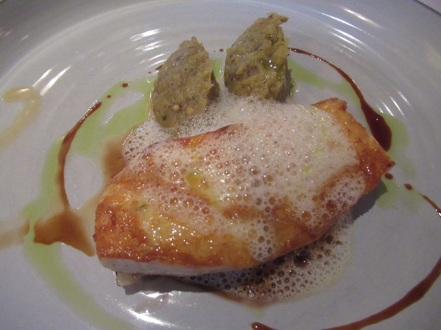 We started with a glass of champagne to celebrate being in St. Moritz before ordering. Everything on the menu looked good, but we were both ready for some fish since we’ve been eating lots of meat along the way. Sue had a clear tomato broth with mozzarella-filled ravioli and I had the gazpacho to start – both were very good. For our mains, we both went with the turbot accompanied by gnocchi and an aubergine mix. It was delicious! We paired our meals with a bottle of Swiss Chardonnay from the Lavaux region that was very nice.