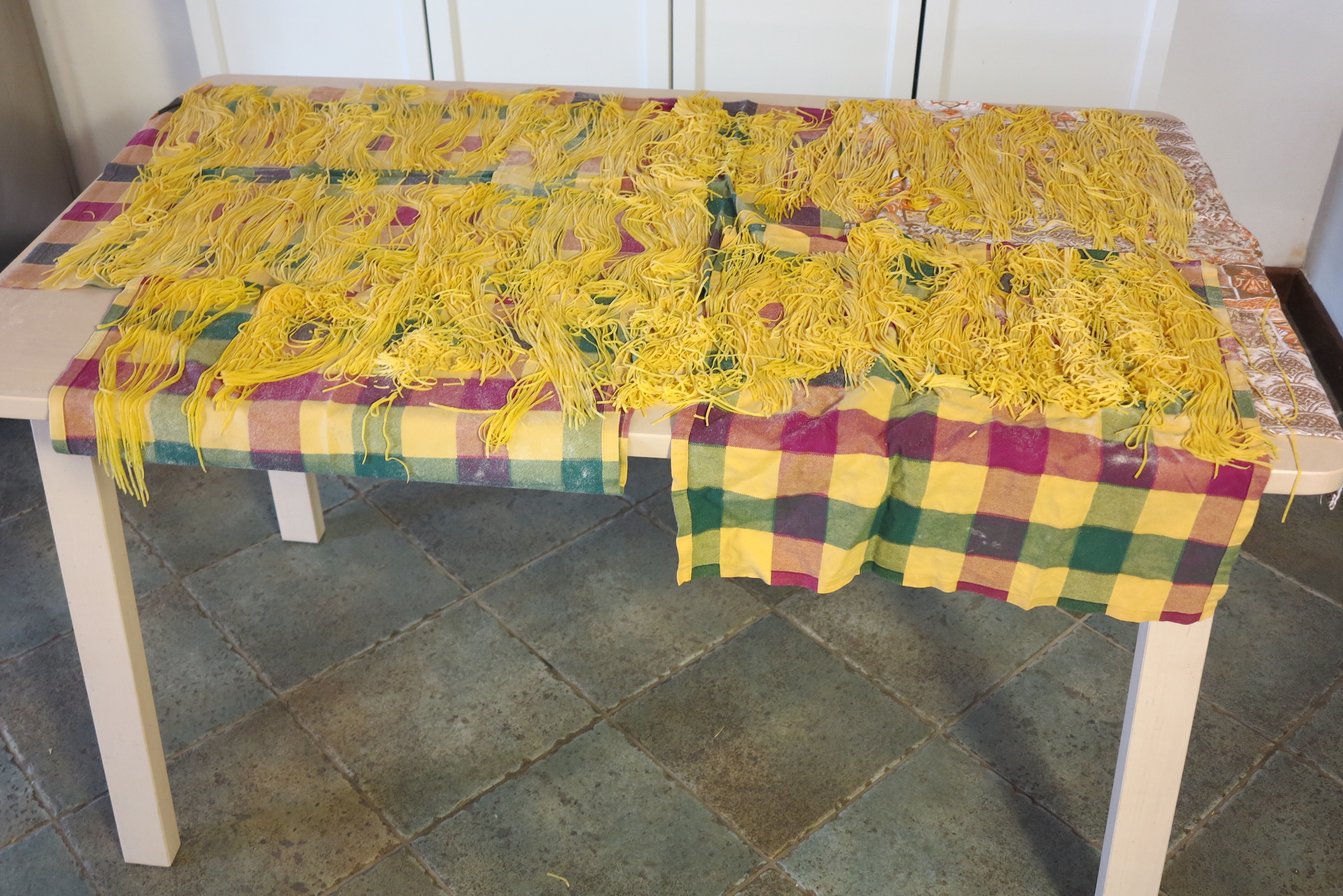 We all created our dough and then merged them together to create a super dough ball. We let it set for a few minutes before breaking out the pasta machines and cranking out sheets of pasta dough. Once those were ready to go, we made our taglioni. Thin, delicate strands of pasta were created with each turn of the handle, then laid out to dry before heading to the boiling pot of water.