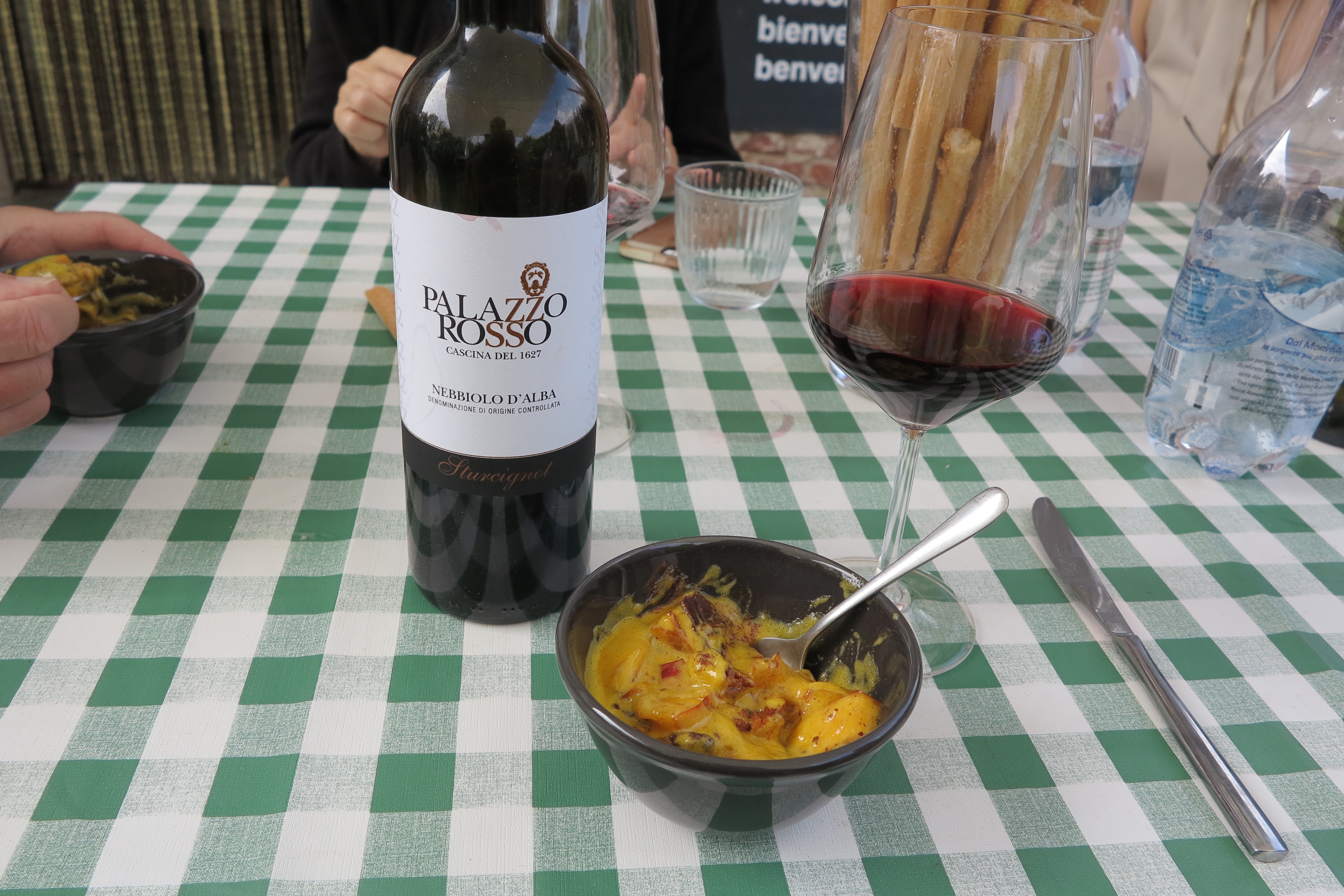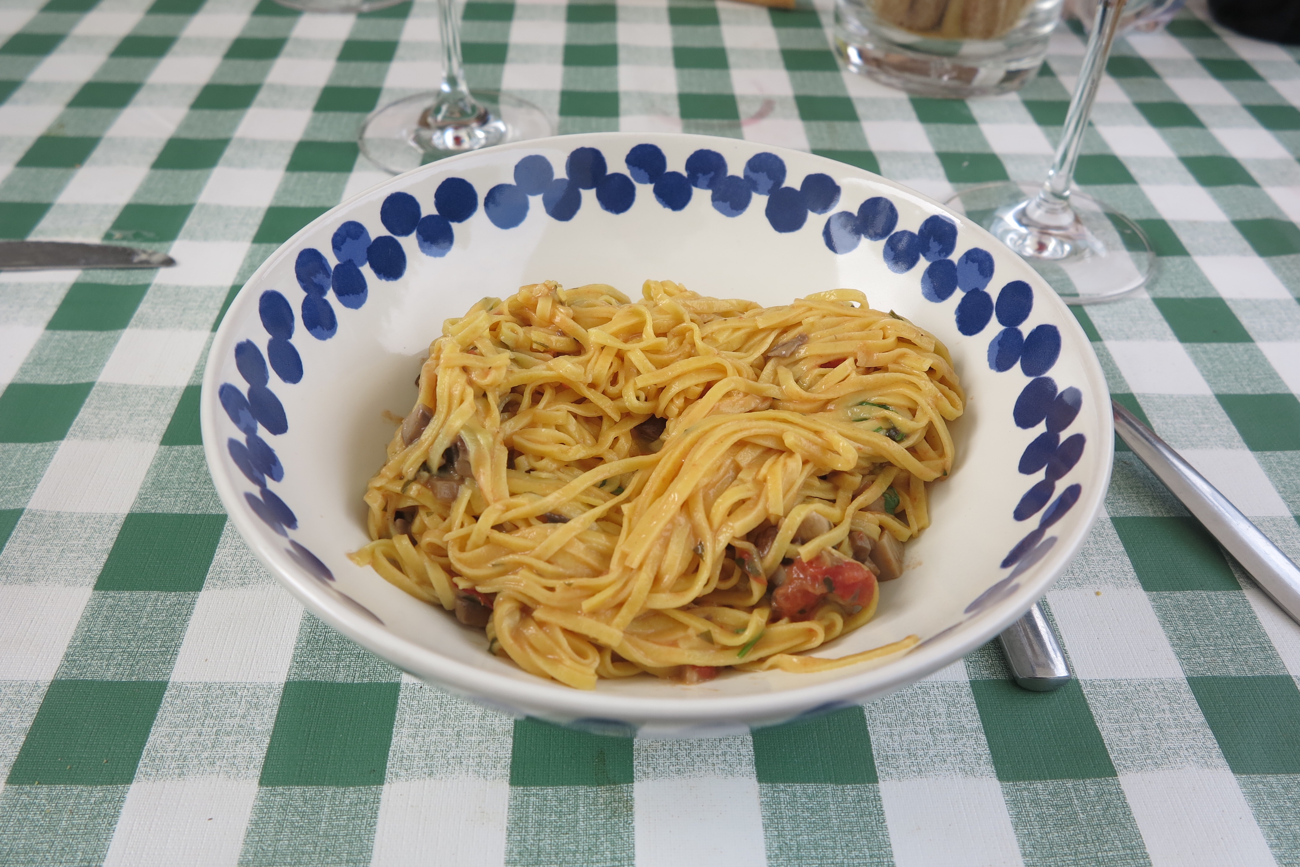 The menu was: Capunet stuffed with pork sausage in a béchamel sauce, Pumpkin cream soup, Taglioni ai Funghi and then fresh peaches with a zabaglione sauce and amaretti. Of course, there was wine!