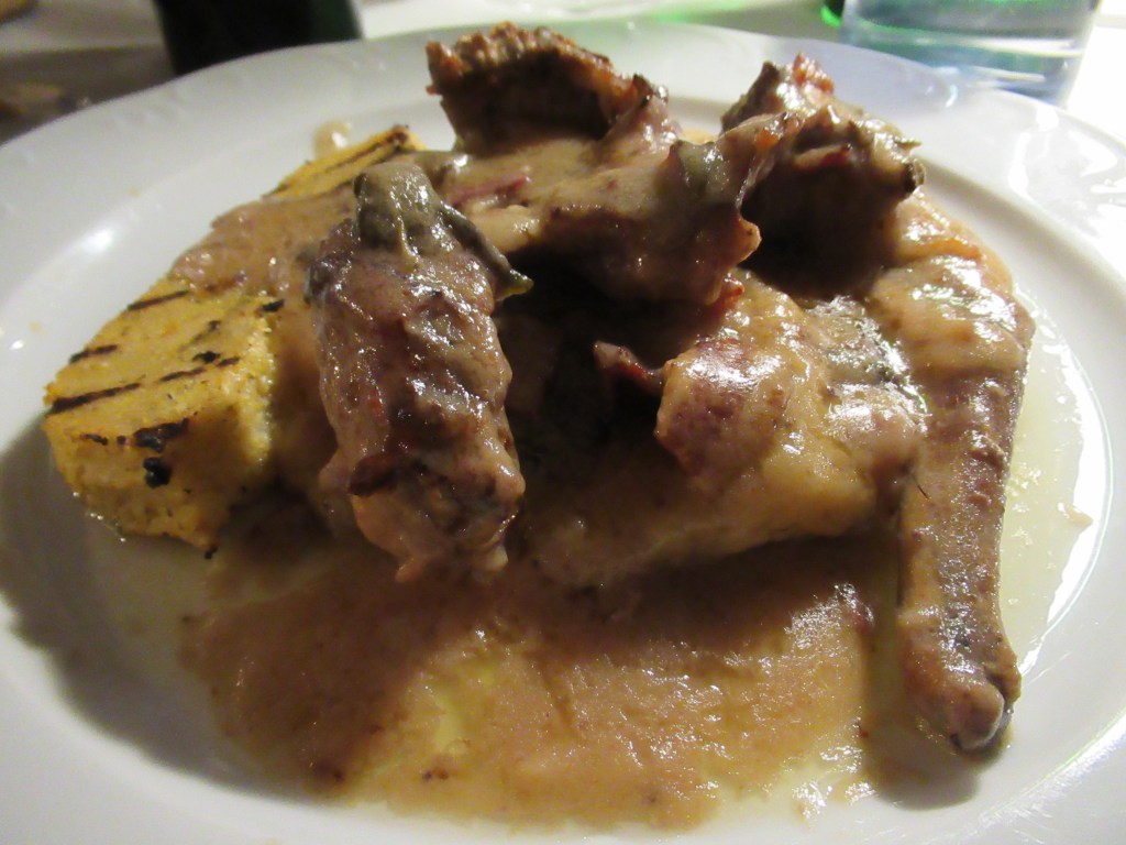 We were seated and started with a glass of prosecco while we looked over the menu. Everything looked delicious and from the tables around us, it all smelled good too! On this evening, Sue started with casoncelli and then followed it up with roasted rabbit with polenta. I had the casoncelli to start and the veal cutlet as my main. On the waiter’s recommendation, we tried a bottle of Barbariccia, produced locally and a nice pairing for our meal.