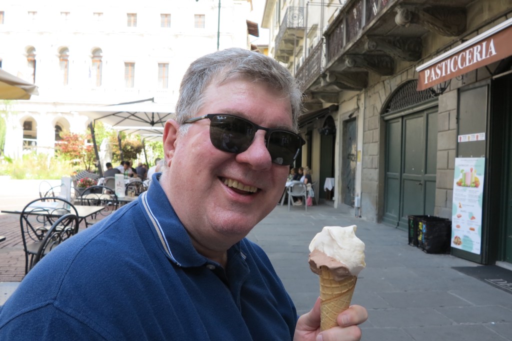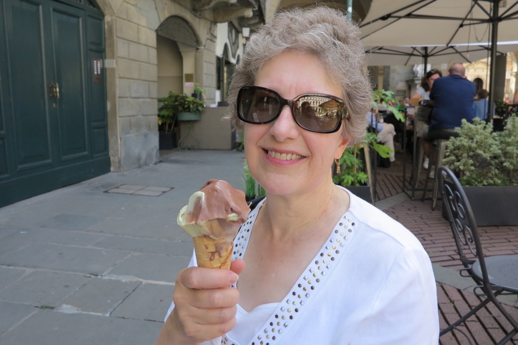 After our walk we needed a little boost, so we found the local gelateria and indulged. Sue was thrilled with a scoop each of pistachio and chocolate, while I enjoyed a mix of chocolate-hazelnut and banana.