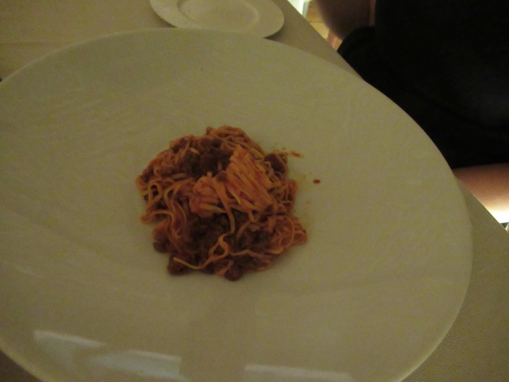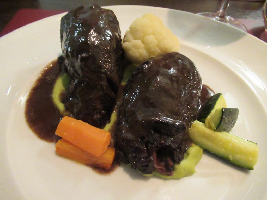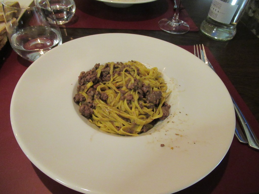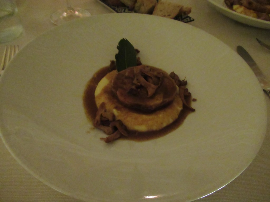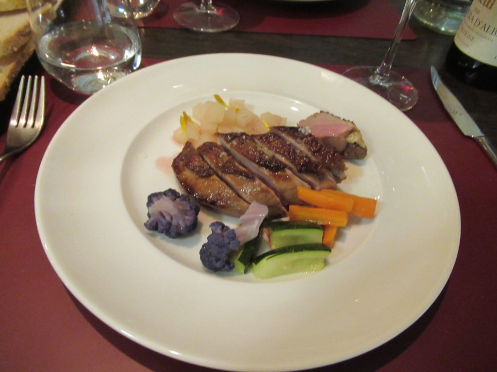So… Sue had an order of tajarin with black truffles and I went with an order of tajarin with a rabbit ragu to start. Our main meals were a melt-in-your-mouth braised veal cheek and roasted vegetables for Sue and a duck breast with vegetables and a pear compote for me. We had a bottle of Viette Tre Vignes Barbera D’Alba to go along with our meal that was wonderful.