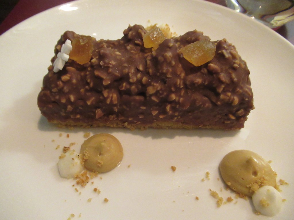 We both enjoyed the four-course tasting menu with a bottle of Cascina Fontana Barbera d’Alba. The meal started with an amuse-bouche of puréed cantaloupe, with bits of bacon, sage and thyme. The first course was a potato with light cheese sauce. The second course was a portion of tajarin with a meat ragu. The third course was roasted rabbit loin on a bed of mashed potatoes. And the finale was a vanilla custard with Carmel sauce and roasted hazelnuts.