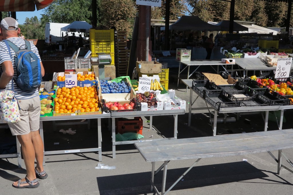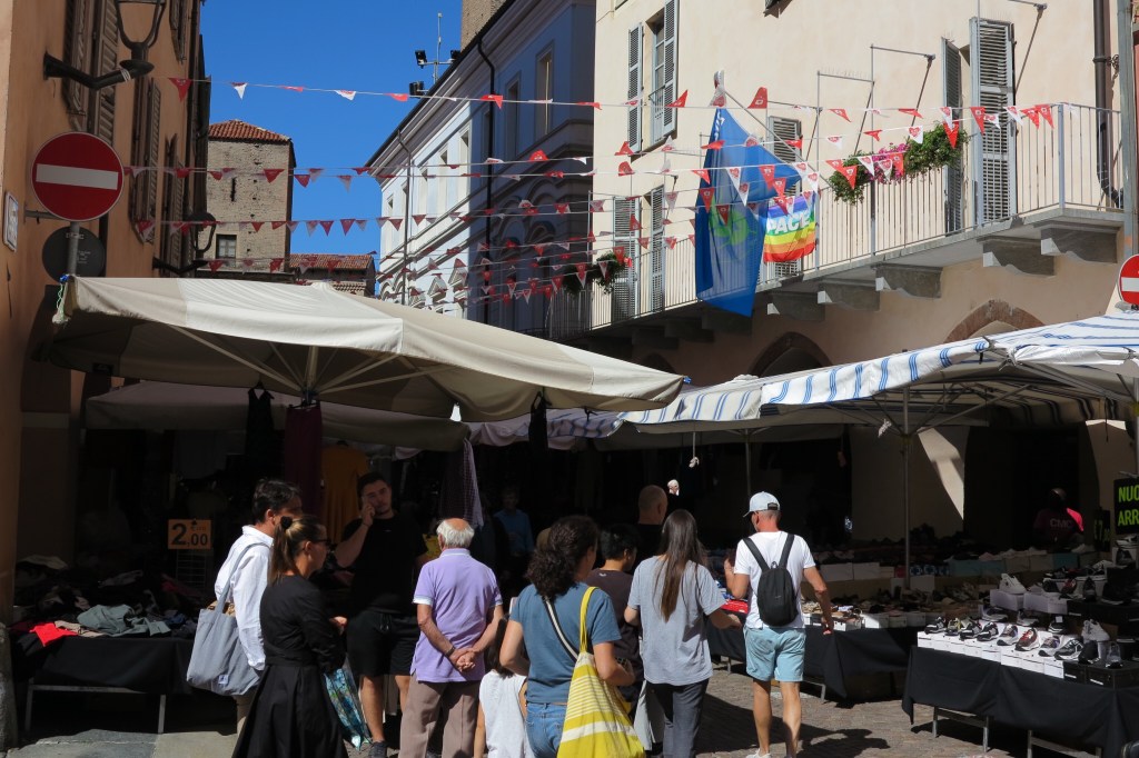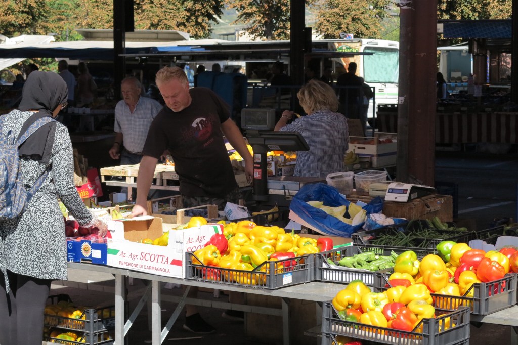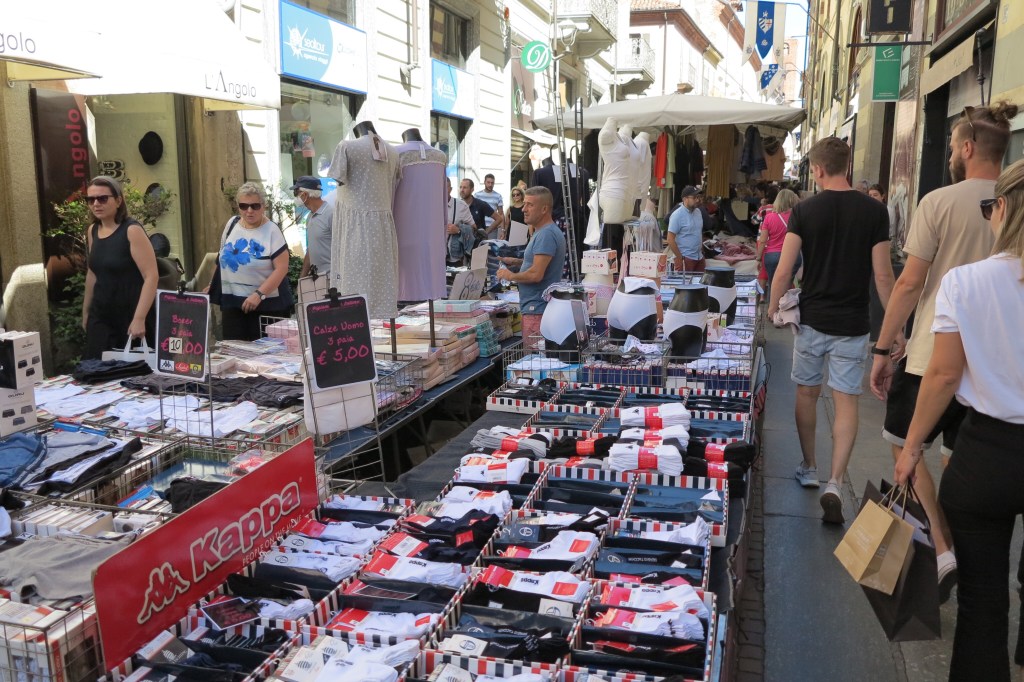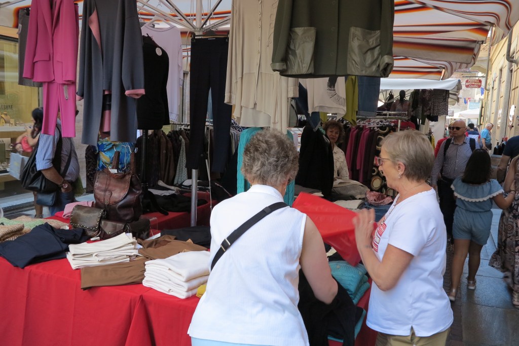 Saturday is market day in Alba, which means lots: lots of people, lots of vendors and lots of fun. We wandered the streets looking at all the goods for sale. Sue found a beautiful Italian-made sweater that will be going home with us.