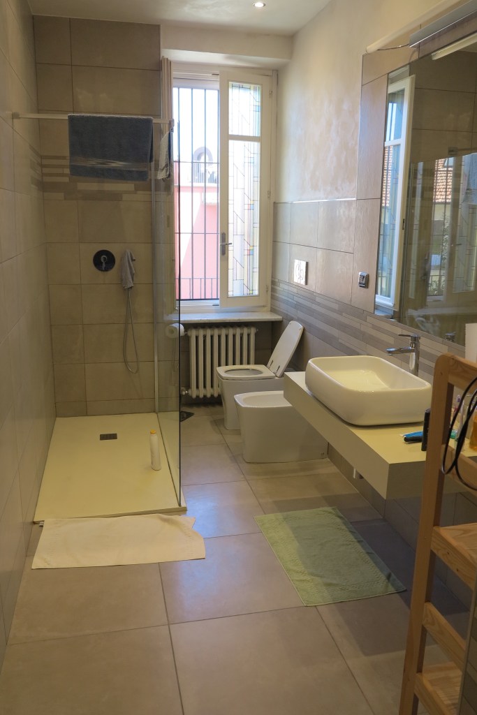 Our home for the next eight days is a spacious apartment that we booked through Airbnb. There’s a kitchen, two bedrooms, two bathrooms – both with great walk-in showers, laundry facilities and a comfortable sitting area. Clean, airy and the windows open for fresh air – and the topper is they have screens! Oh yeah…and there’s an elevator.