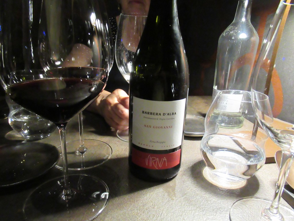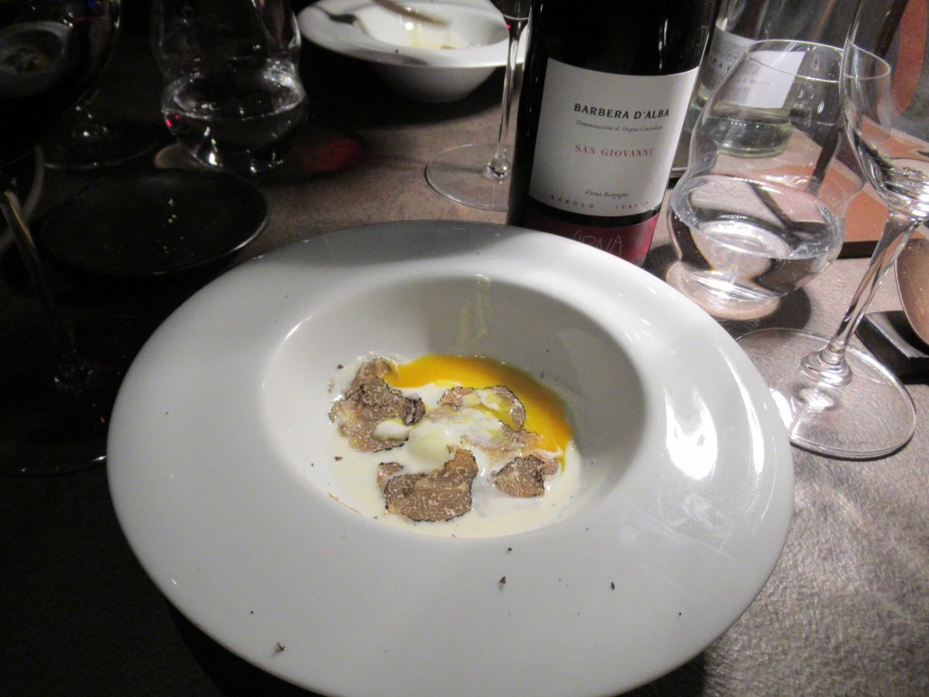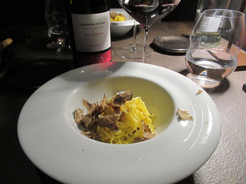 For dinner, we went with the Chef’s Truffle tasting menu paired with a bottle of Virna Barbera D’Alba. The menu was five reasonably sized courses, each with tartufo nero (black truffles) except for dessert.