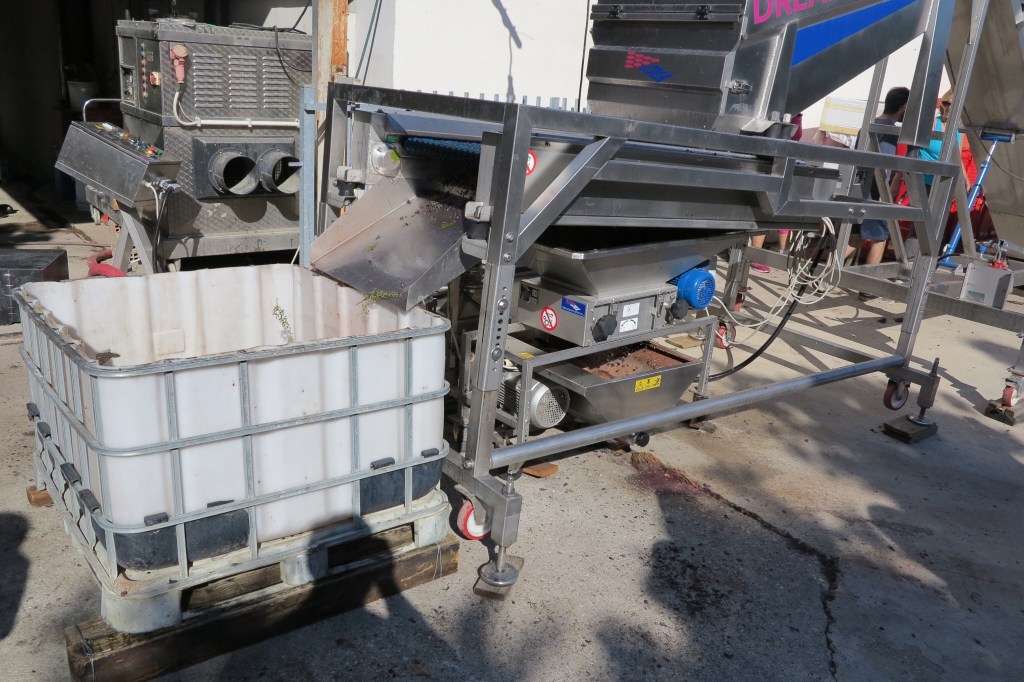 After the tastings and paperwork, we were able to walk across the street to watch as they were beginning the crushing process on some newly picked grapes. The grapes are all handpicked, then fed into a de-stemmer that shakes the berries off of the vines. The stems go to the compost pile, while the grapes head to the crusher to start the process. Fun to watch.