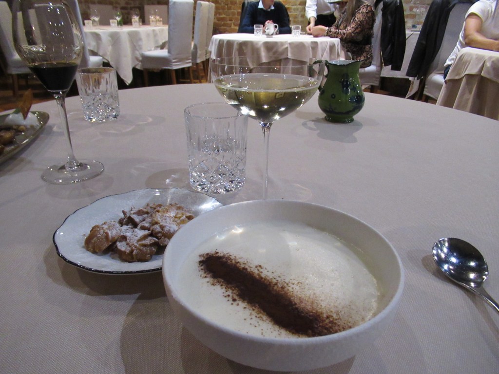 For dessert Sue had Zabaione infused with Moscato and served with corn meal cookies, while I had baked peaches topped with cocoa and amaretto served with a peach sorbet. Sue’s was paired with a glass of moscato, while I had a glass of Pedro Ximenez Montilla-Moriles.