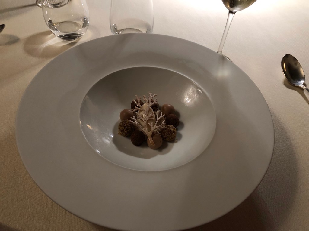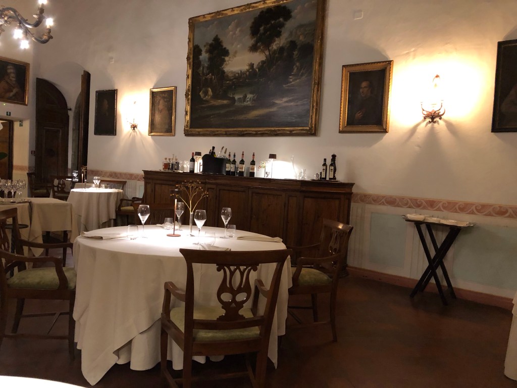 Dinner tonight is at the second of the two restaurants – Il Pievano. We didn’t know what to expect, but were pleasantly surprised. Besides the ala carte menu, they had three tasting menus – Mrs Jekyll, Dr Jekyll and Mr Hyde. The two Jekyll menus were five courses and the Mr Hyde was a ten course menu.