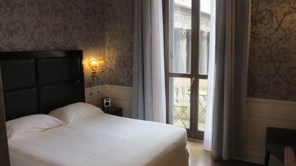 We are staying at Albergo del Senato. We truly love our hotel. The rooms are comfortable, the staff are all friendly and helpful and the location is wonderful. We are located on the Piazza della Rotonda, about 100 feet from the Pantheon. There are plenty of cafes and restaurants around the piazza and even more within a five minute walk. And yes, there is also a rooftop bar that is a perfect place to rest our weary legs after walking around.