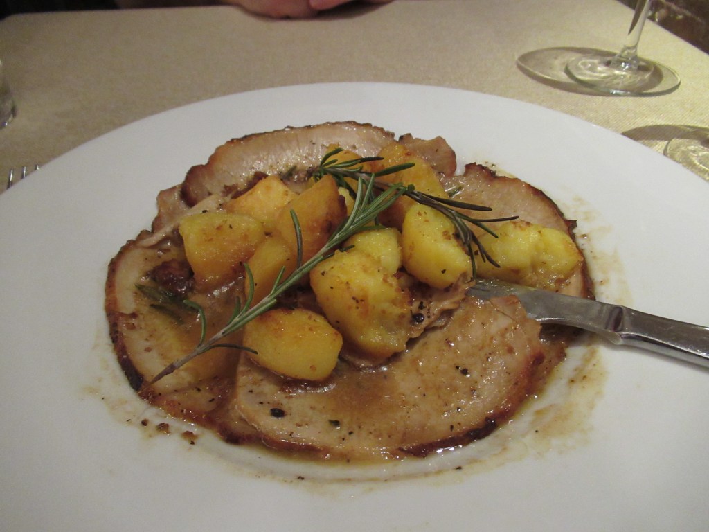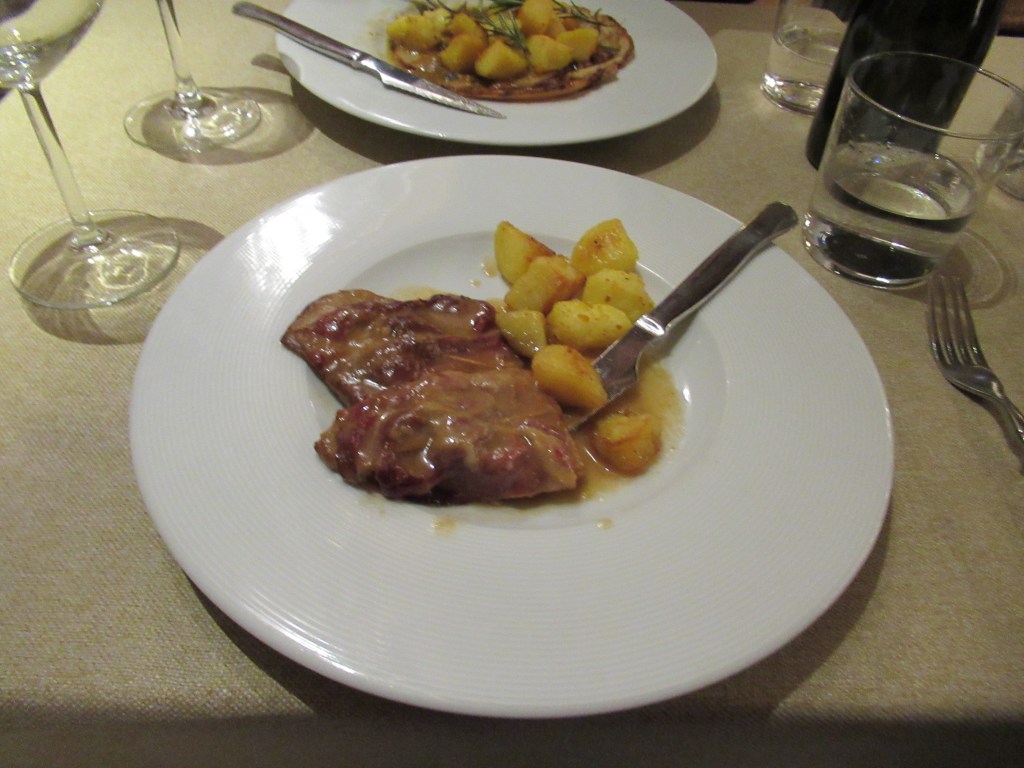 And then came the meal. We started with a potato, spinach and goat cheese combo that was great. Then Sue had a baked lasagne with asparagus points, while I chose a fusili pasta with artichokes and guanciale. Our main dishes were a thinly sliced roast pork loin with rosemary potatoes for Sue, and veal saltimbocca with the same rosemary potatoes for me. Everything was perfect and paired well with the wines.