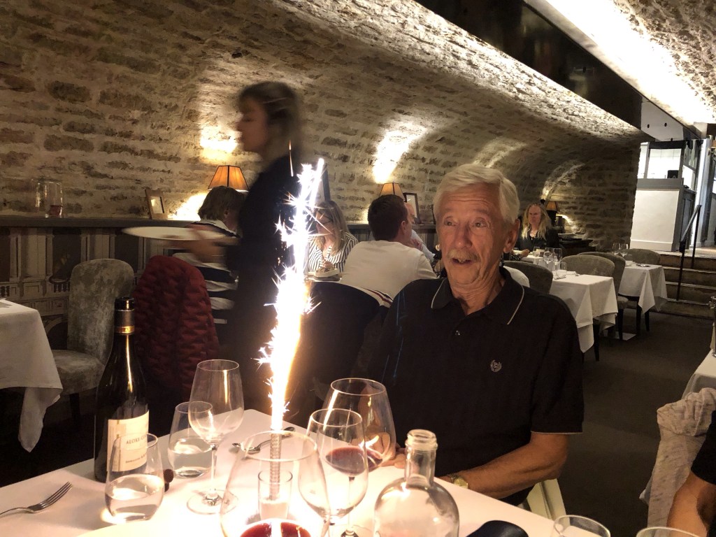 The dinner was delicious and we had some great wines. When dessert was being prepped, I saw our waiter lighting up a sparkler. He and the hostess then delivered them from behind Dave while many joined in to sing happy birthday. He was surprised, which made it all the better.