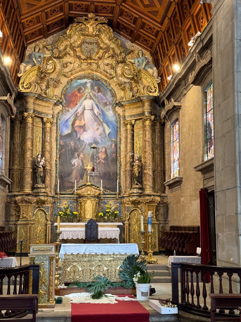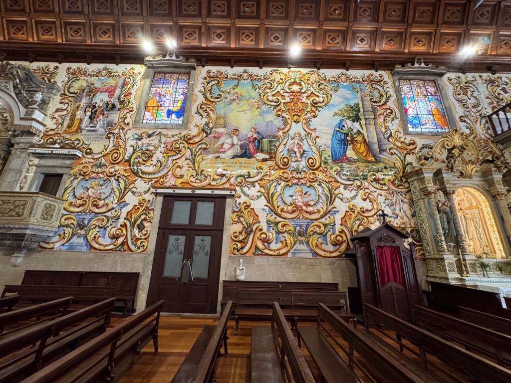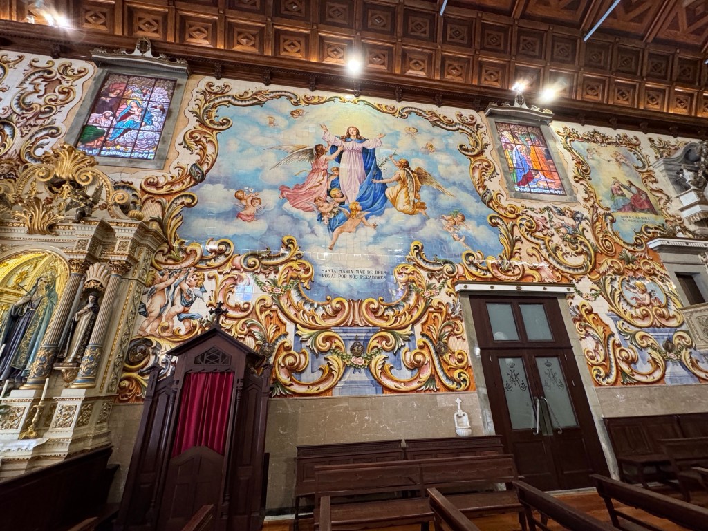 Válega is a small town that lies south of Porto. It has a church that is beautifully decorated with azulejo tiles and was built to honor the Virgin Mary. It has undergone restoration work to keep it as beautiful as ever, with restoration continuing during our visit. The ‘illustrations’ seen on the exterior of the church and the interior side walls of the church are all ceramic tiles. The effect is absolutely stunning. During our visit, ladies of the parish were scrubbing the altar and arranging greenery for the weekend Masses.