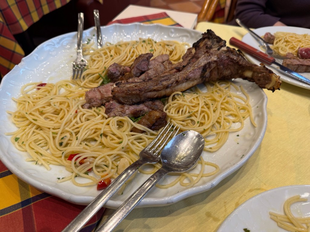 Instead, we had a special beefsteak and spaghetti for two. Our waiter was great in steering our decisions. A bottle of Chianti became a bottle of Bairrada. Honestly, he was right on target. We can get pizza another time.