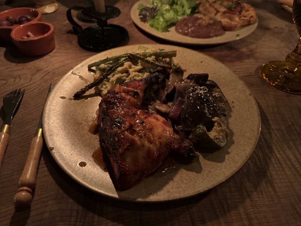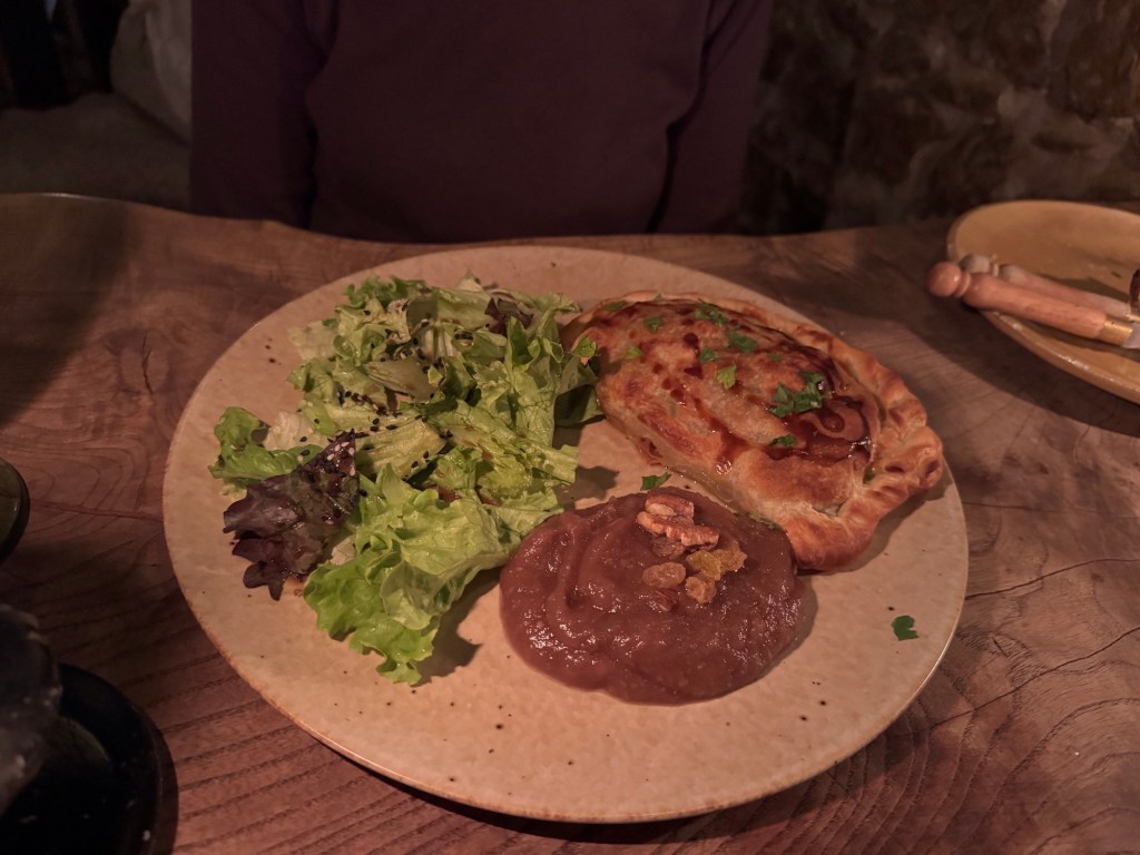 Our waitress was a delight. We chit chatted for a few minutes before ordering and before the restaurant got busy. Sue ordered the wild boar pie with vegetables, I ordered some asparagus tempura to share and then the roasted chicken leg with vegetables and herbed grain. They have wines at various levels from house to royalty; we selected a wine at the Clergy level that was very good.