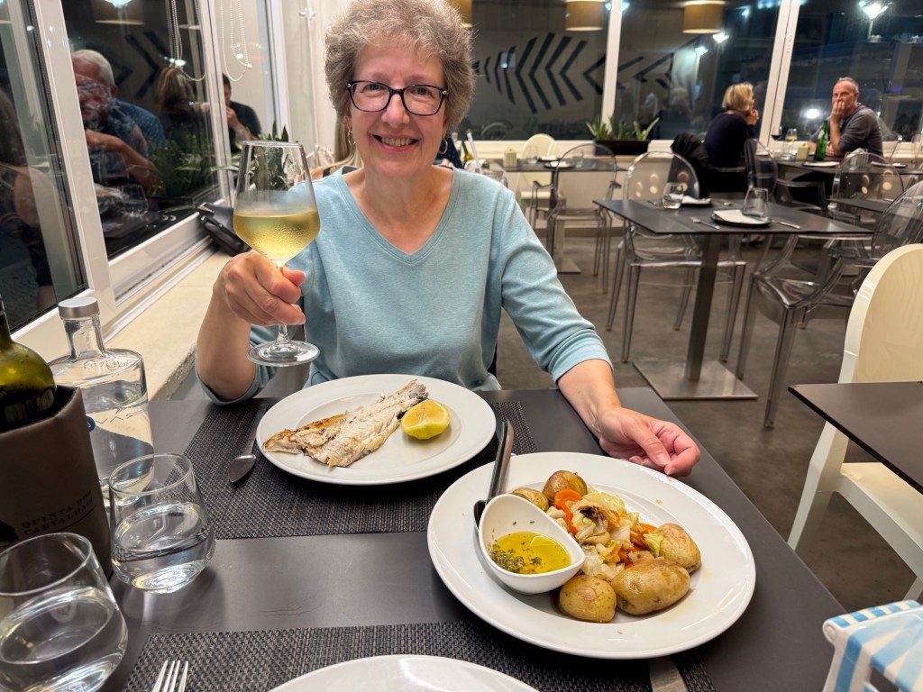 A big goopy hamburger or plate of pasta was not on the menu. Tonight, it would be fresh fish. We started with a mixed green salad and then we shared a freshly grilled sea bass. The fish came with roasted potatoes and roasted vegetables.