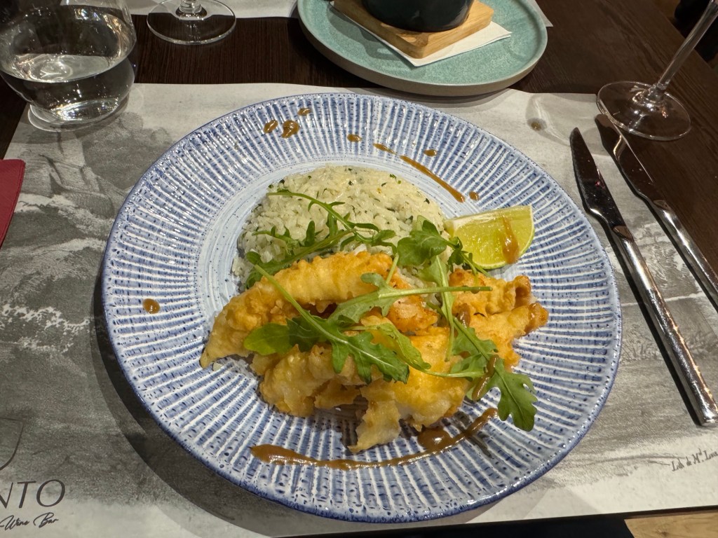 After our enjoyable happy hour excursion the day before, we decided to go back to DizTinto for dinner. Luckily, we had made a reservation as they had a full house. We had a wonderful bottle of wine to help warm our cockles, along with some Shrimp in a garlic sauce. Then, Sue went with the braised pork cheeks with smashed citrus sweet potatoes while I had the John Dory fish with jasmine rice.