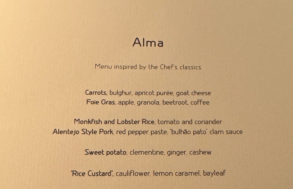 Our restaurant for the evening was Alma. It is a 2-Star Michelin restaurant led by chef Henrique Sa Pessoa. Alma means ‘Soul’ in Portuguese. On this evening, the chef and staff poured their souls into making our dining experience amazing.