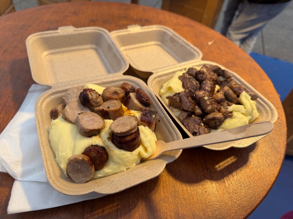 We walked around for a while, were enticed by a few vendors to try their goodies – nougat, gingerbreads, spiced breads, cheese and nuts, and then grabbed a little bite to eat. We both had a dish of Aligot: Sue’s with duck breast and mine with sausage. Both were delicious treats.