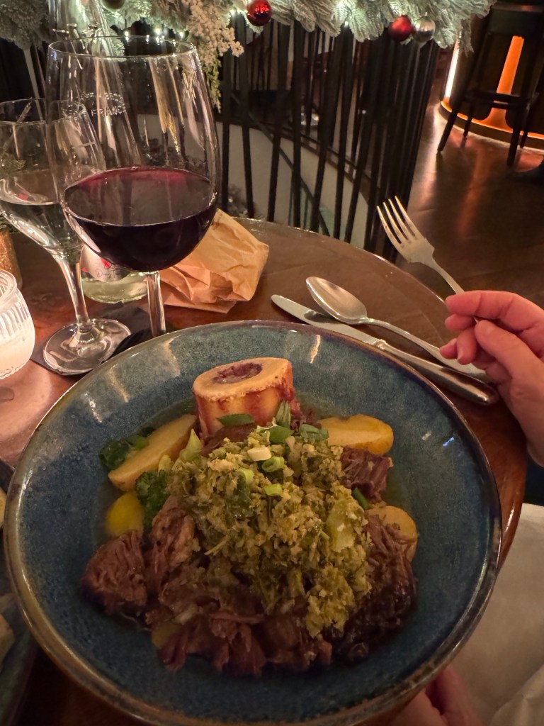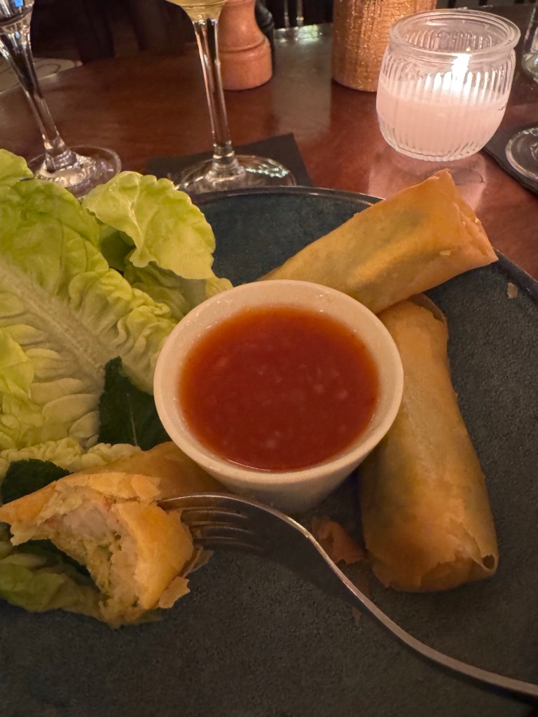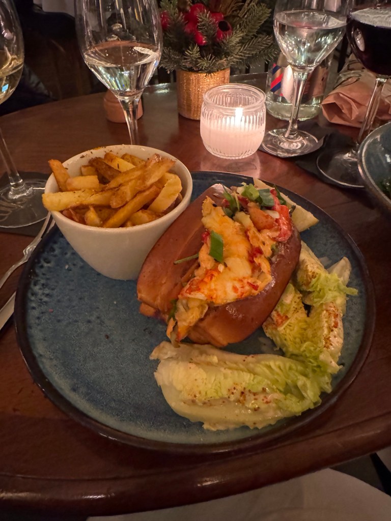 We started off with a glass of champagne just to be festive. For starters Sue had a delicious pork terrine and I had house made seafood spring rolls with shrimp and salmon. For our main plate, Sue had the braised beef cheeks while I continued with the seafood theme and had a lobster roll. Sue had a glass of red burgundy, while I went with a white chablis. Everything was awesome.