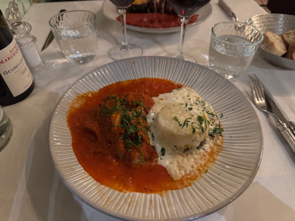 For our mains, Sue had osso buco and I had the duck breast. Again, both were delicious! We paired our meals with a young Gevrey-Chambertin red burgundy wine, which paired perfectly.