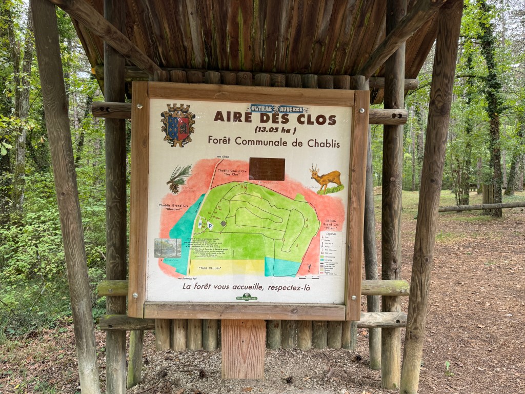 The views on the way up were beautiful. Most of the grapes had already been harvested, so we didn’t run into any machinery or pickers or get in anybody’s way. We made our way up to the top of the Les Clos climat and found a little park. You could walk through the woods to an observation point, but we chose not to go. Instead, we chose to turn around and head back down.