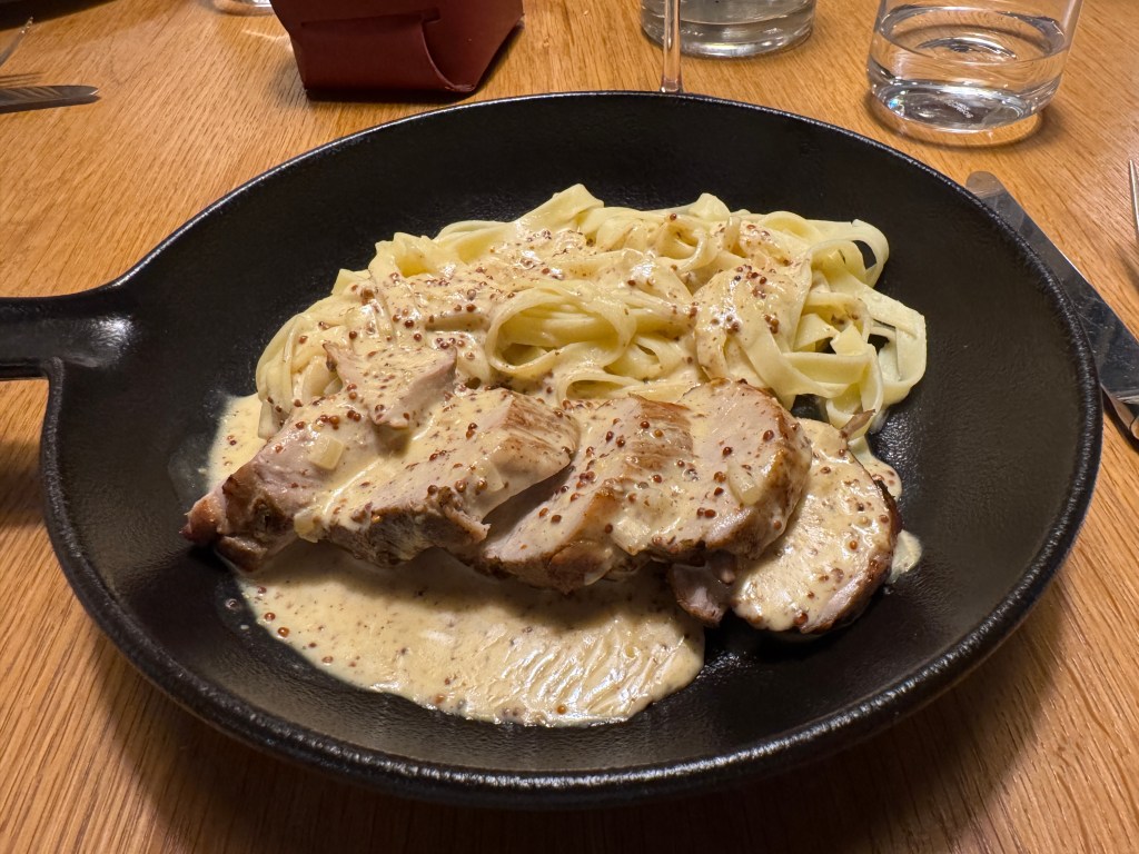 No matter – they were well behaved and we were there for dinner. We had a good mix of meals around the table. Michael started with the gazpacho followed by the duck breast, Nancy and Sue both went with the pork tenderloin in a mustard cream sauce with linguini and I started with the tomatoes and burrata followed by the boeuf tenderloin with mashed sweet potatoes. Sue and I did partake in dessert: she had a mille feuille and I had a creme bruleé. We paired the meal with a 2022 Chambolle Musigny red burgundy.