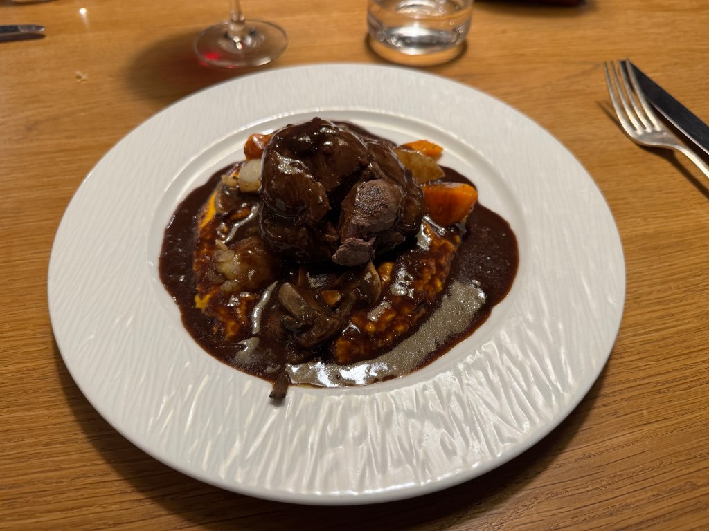 A quick change of clothes and we were off to the restaurant. It’s only a 7 minute walk, so we had plenty of time. We started with an aperitif on the terrace while we waited for our starters. The restaurant was quite busy with couples and groups of people scattered throughout. We assumed that many of them were in town for the harvest. The three gentlemen seated next to us looked a little bit hammered and had a bit of instability in their gait on the way to the mens’ room.