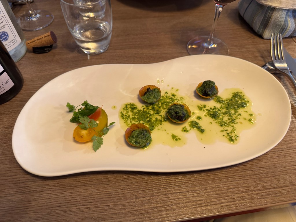 We kept it simple with an entrée and dessert, as we’ve been eating bigger meals throughout the week. Everyone tried something different and we all enjoyed the meal. As seen above, my meal was a nice grilled salmon and an il flottante (floating island) for dessert. Sue also had the salmon, Nancy a salad with warm goat cheese and bacon and Michael had a grilled pork dish with a delicious sauce. The trio of desserts are above – my il flottante, Sue’s pistachio creme brulée and Michael and Nancy’s fruit pavlova. We really enjoyed a bottle of 2020 Domaine Pattes Loup – Premier Cru Beauregard with our meals.
