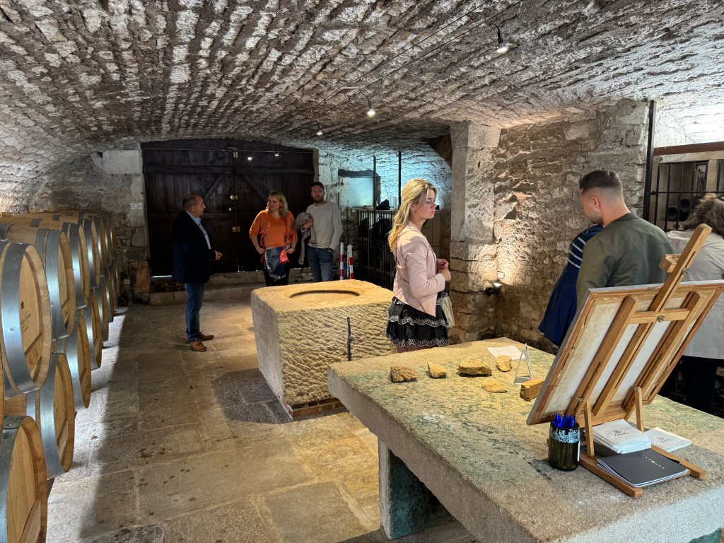 After learning about the history of the Obediencerie, we ventured inside to see the barrel storage rooms and aging rooms. It was interesting to see the wines that have recently been moved to the barrels. You could actually hear them fizzing as the yeast was doing its job. One of the techs was doing some work testing the acidity and sugar levels of the barrels as we were passing through. In the aging caves, which date back to the 9th and 10th century, there were some barrels of Grand Crus that just wanted to come home with us….but alas, they could not.