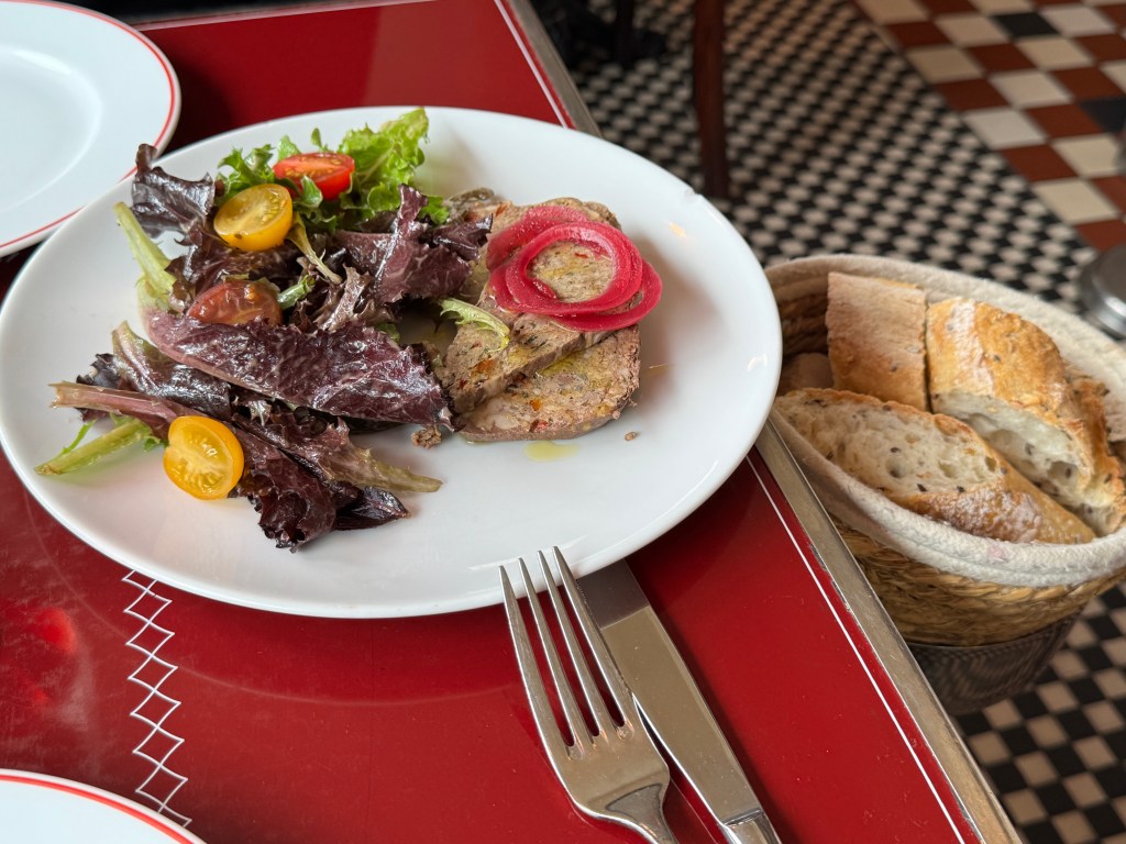 We ordered a duck terrine that we split, then we both had the signature duck confit. We also ordered a bottle of red burgundy – 2022 Domaine Nicolas Rossignol Volnay.