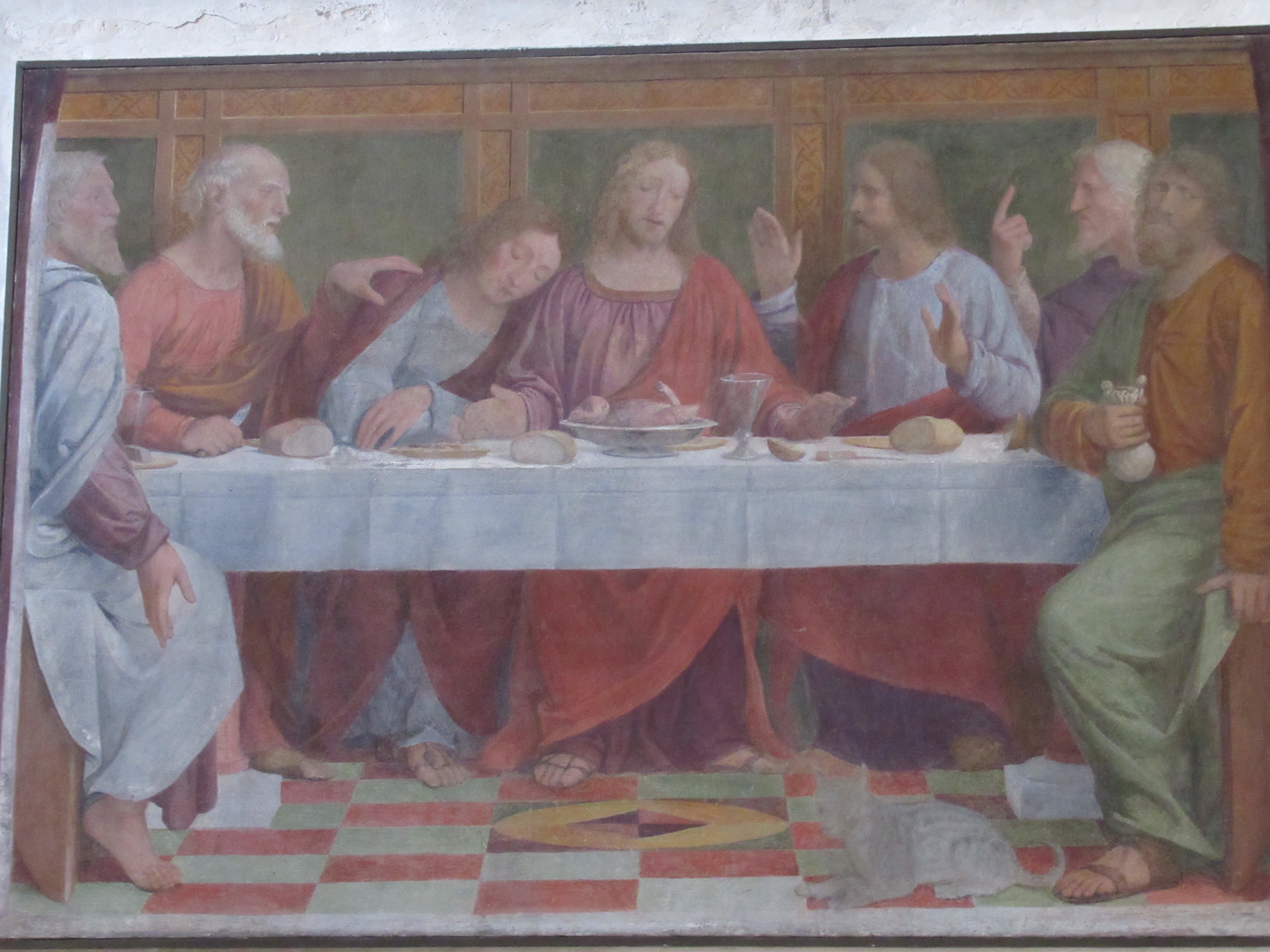 The painting is not in a gallery or hanging in a church. The painting is a mural that was painted on a wall in the refectory of a convent. At one point the room was used as a dining hall for the monks after they took over the convent.