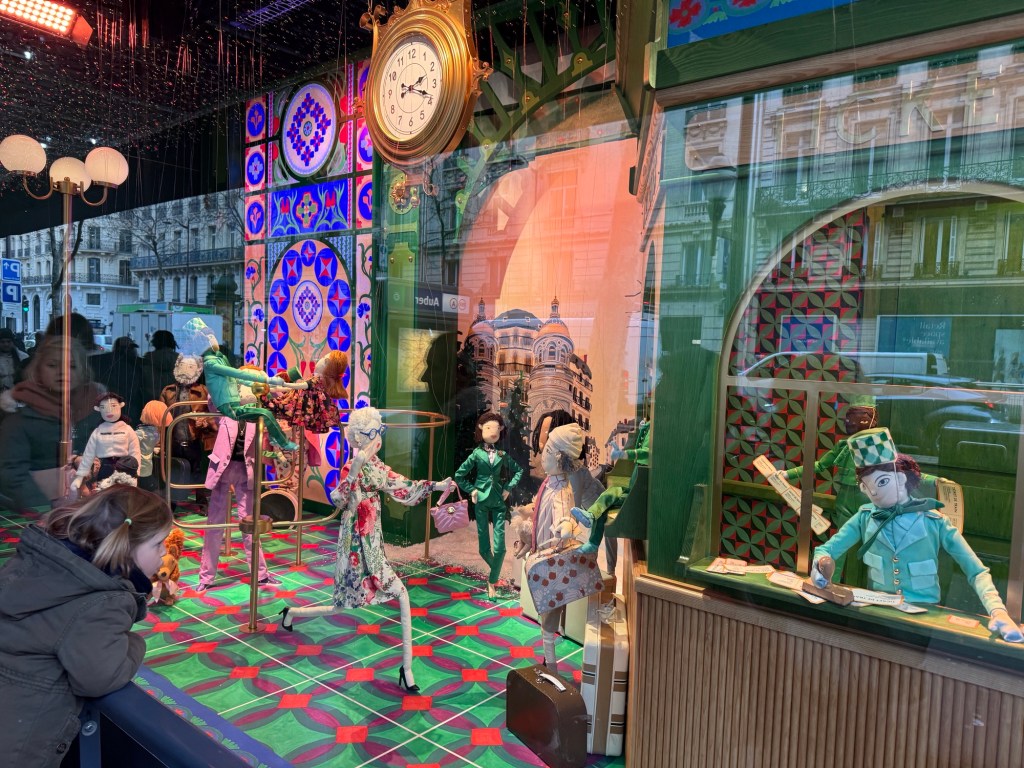 Today we decided to visit the “Grand Magasins” or big department stores to see their holiday displays. Both the Galeries Lafayette and Printemps are decked out for the holidays with window displays and decorations throughout the stores.