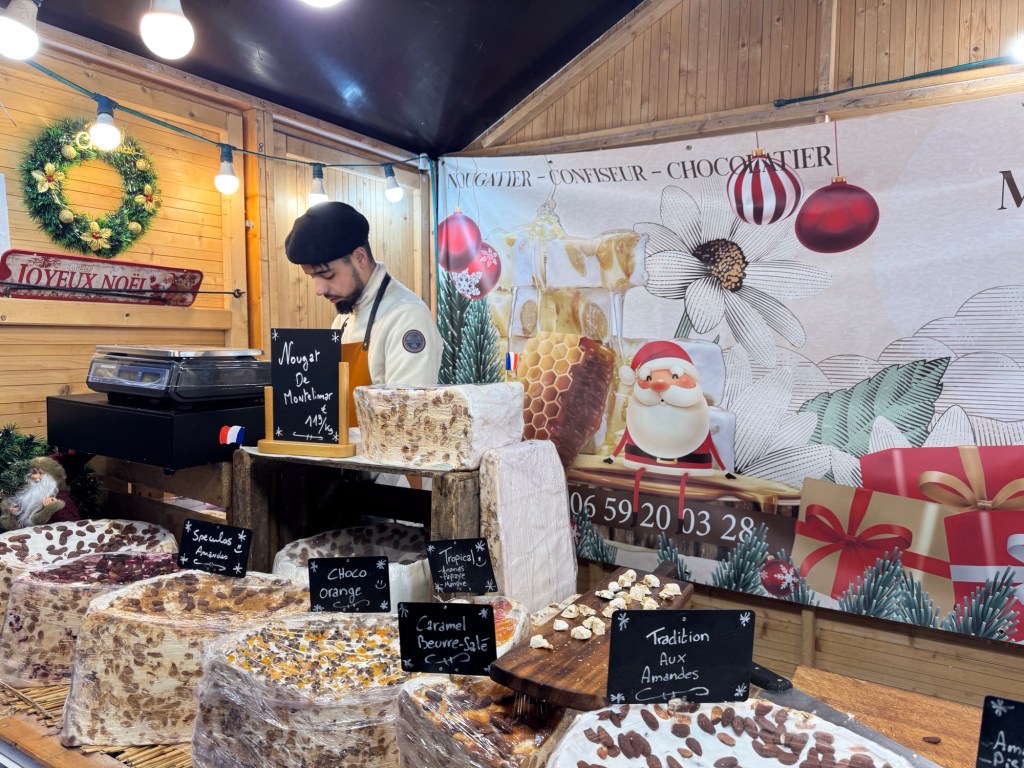 With that little difficulty settled, we headed to the Marche de Nöel. This is a huge market. There are over two hundred stalls, plus rides for the kids and a separate area where they hold concerts.