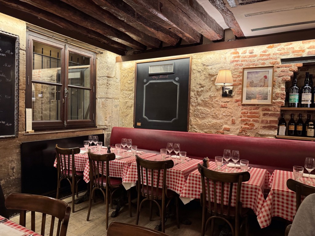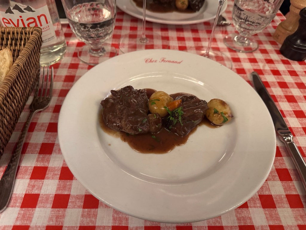 For dinner, we ventured over to Chez Fernand – Christine. It is located in the heart of the 6th arrondisement and is highly regarded for their boeuf bourguignon. It’s tucked away on a small side street and there were people waiting outside to get in when we arrived. They have two seatings each evening at 7:00 and 9:00.